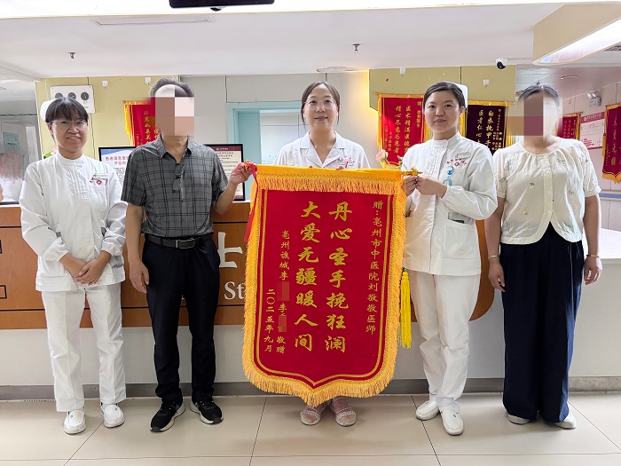 經過及時治療,老人目前已平安回到亳州。老人家人對劉敬敬醫(yī)生危難時刻的救治感激不已,多次致電鐵路工作人員,希望能獲得劉醫(yī)生的信息,想要當面表達感謝,但都被劉醫(yī)生婉言謝絕了。然而,患者家人并未就此放棄,9月10日,特意來到我院,送上一面寫有“大愛無疆暖人間,丹心圣手挽狂瀾”的錦旗,以表達他們最誠摯的感激之情。