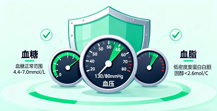 1.控好“三高”是基礎:嚴格遵醫(yī)囑吃藥,把血糖、血壓、血脂控制在目標范圍內(nèi)。比如空腹血糖盡量控制在4.4-7.0mmol/L,血壓不超過130/80mmHg,低密度脂蛋白膽固醇(“壞膽固醇”)控制在2.6mmol/L以下(高危人群需更低)。